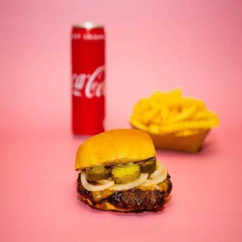 Steak haché "frais et bio", ketchup, moutarde, pickles, oignons rouges et Cheddar mature.
